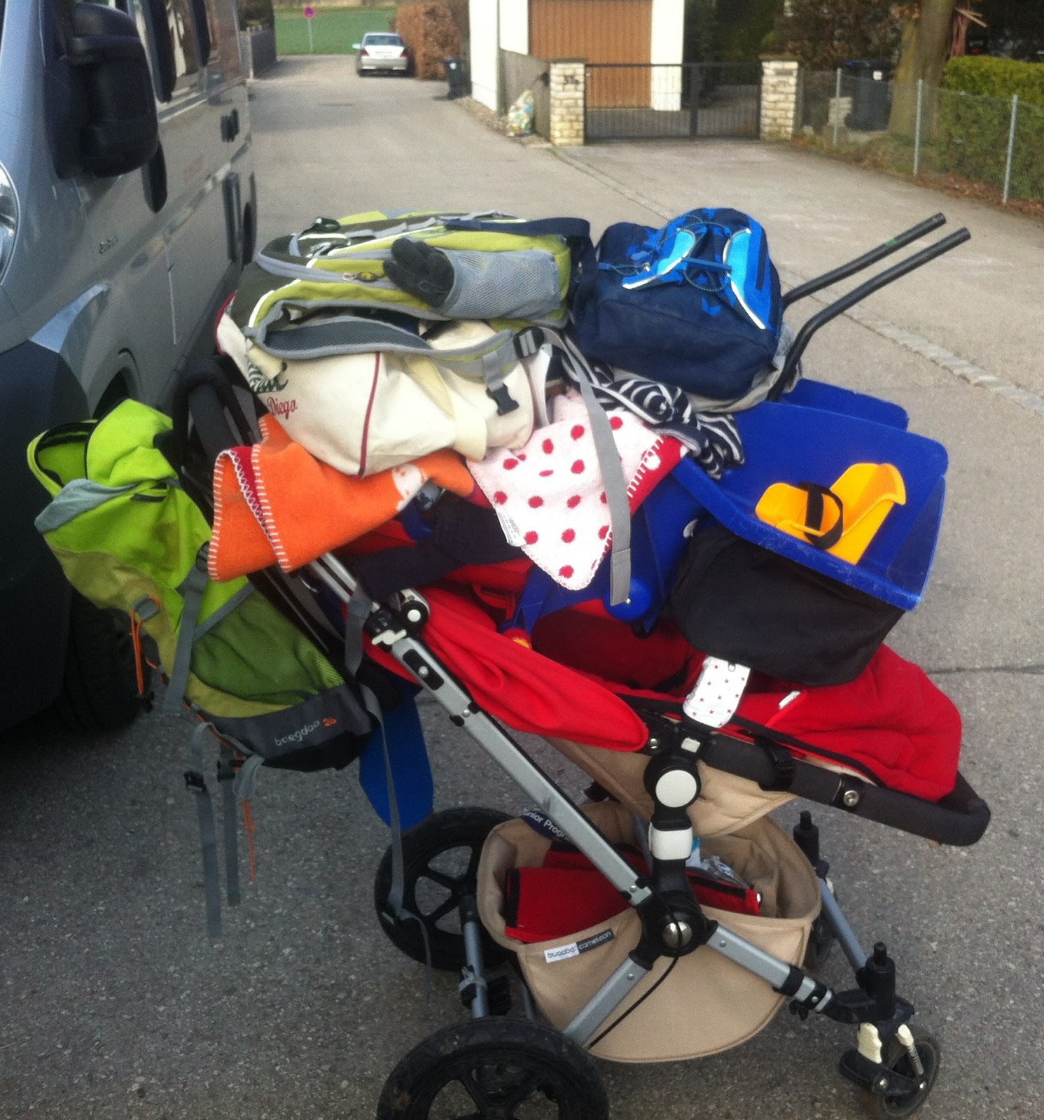 Und wenn ich dann nachmittags nach Hause komme mit den Kleinen heißt es all die schönen Sachen wieder aus dem Auto Richtung Haus zu transportieren. Das schaut dann z.B. so aus: